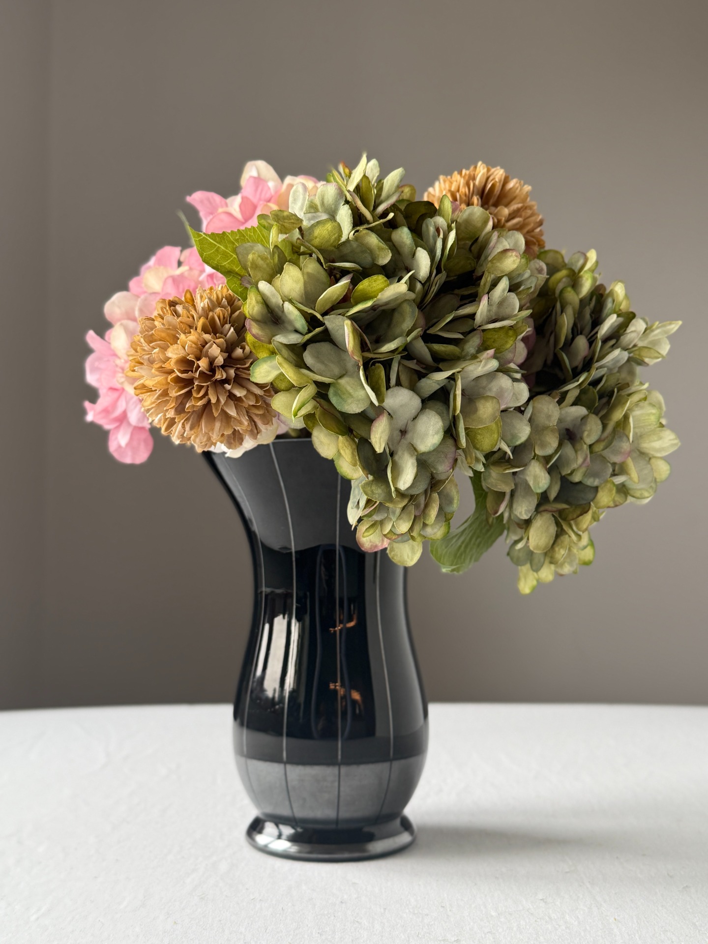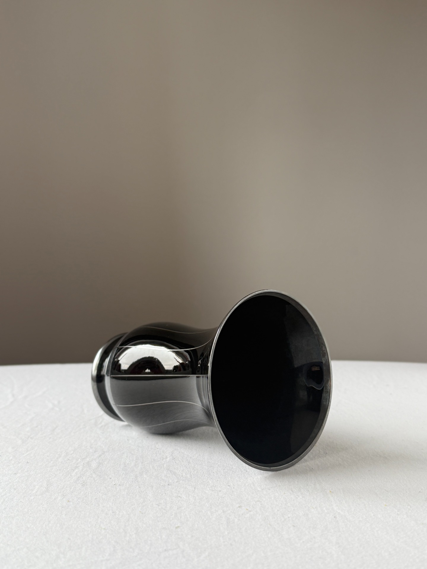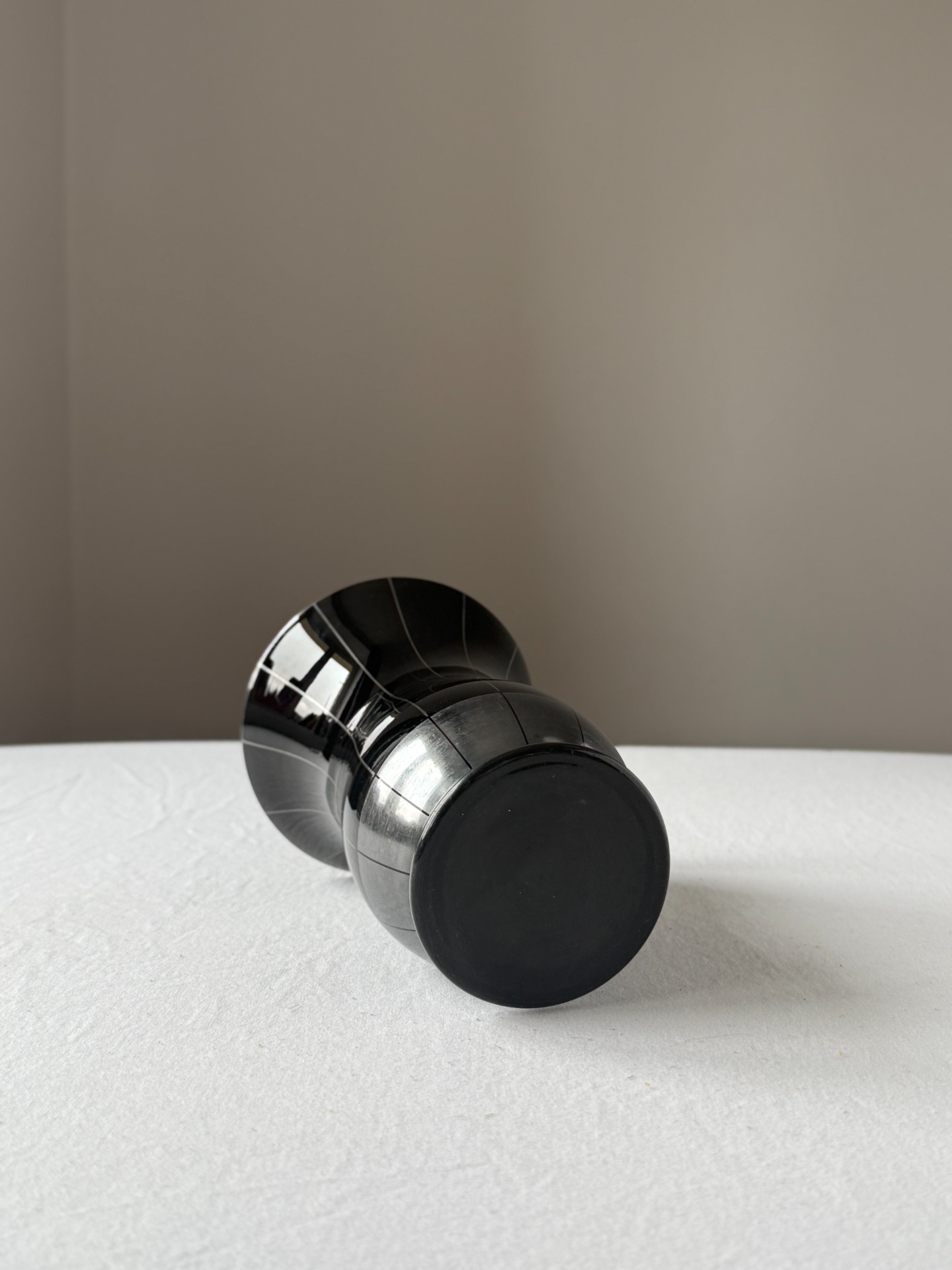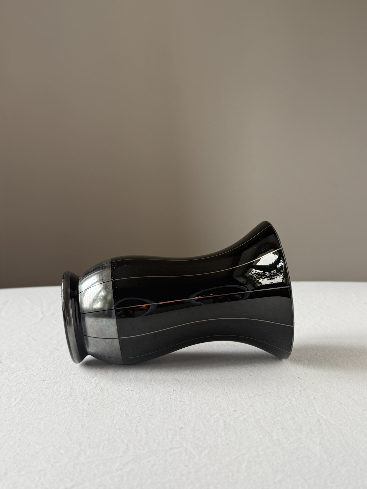 Minimalistický dekor tvoří subtilní svislé linie a stříbrný pás při spodní části, které podtrhují geometrii tvaru a kontrast mezi hlubokým černým leskem a kovovým akcentem.