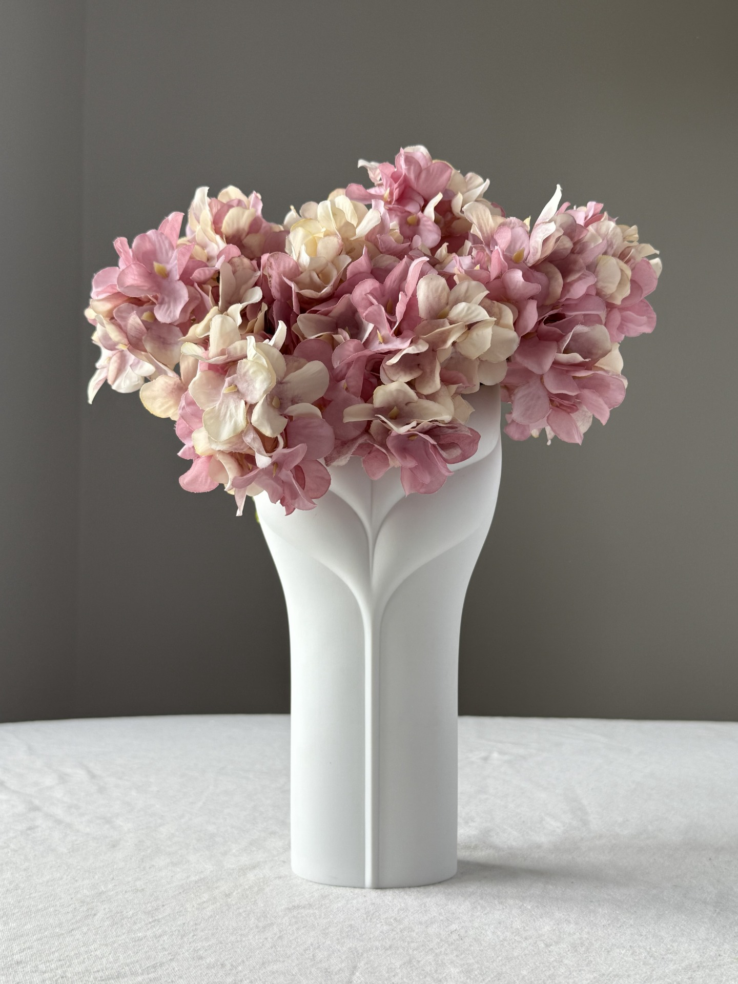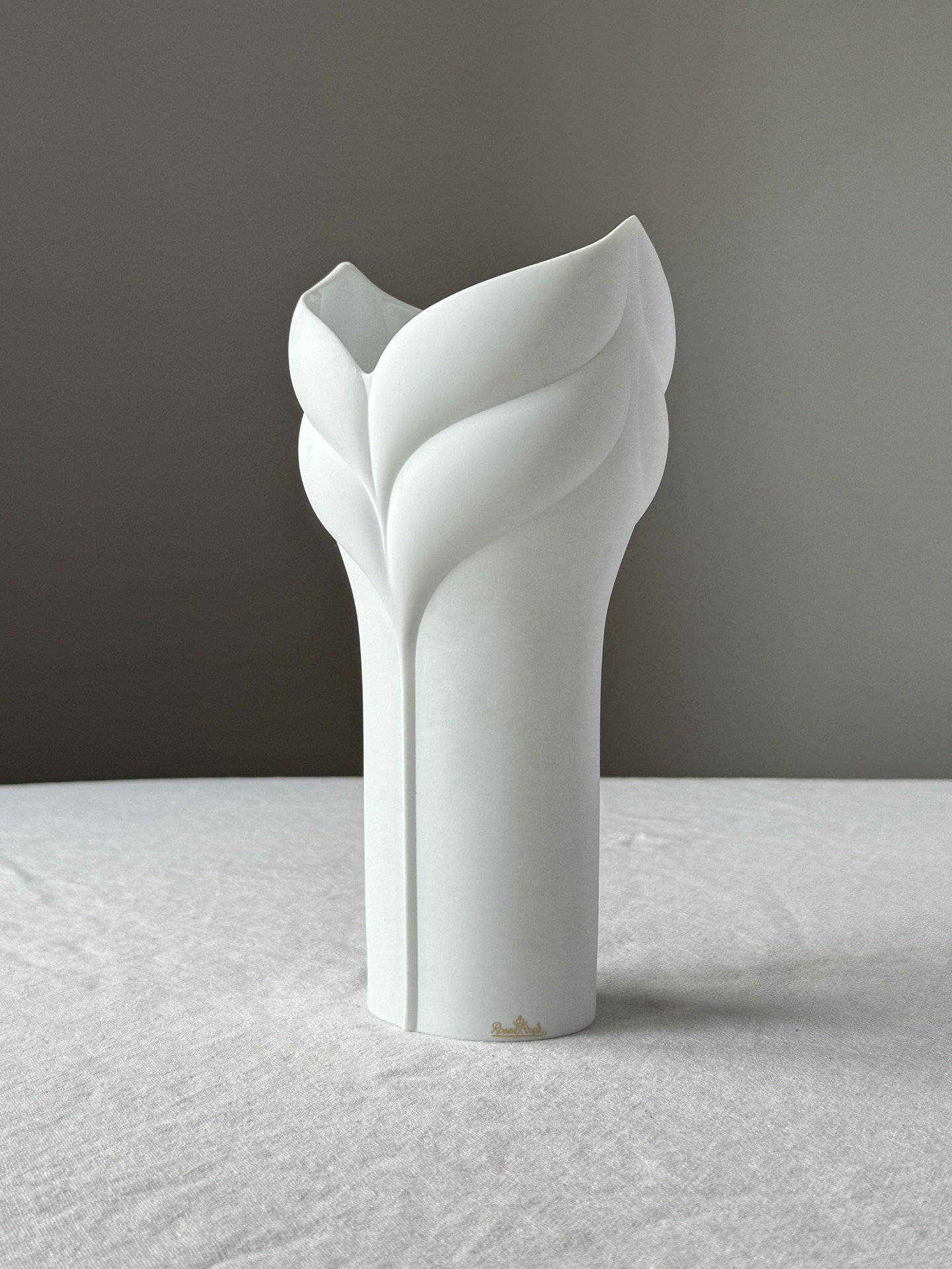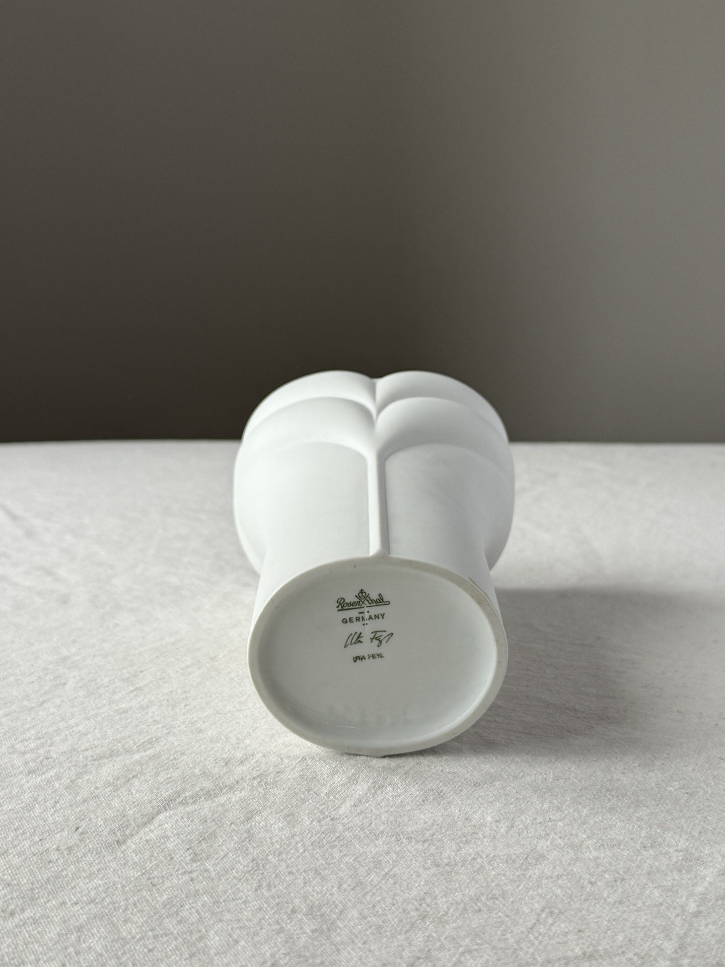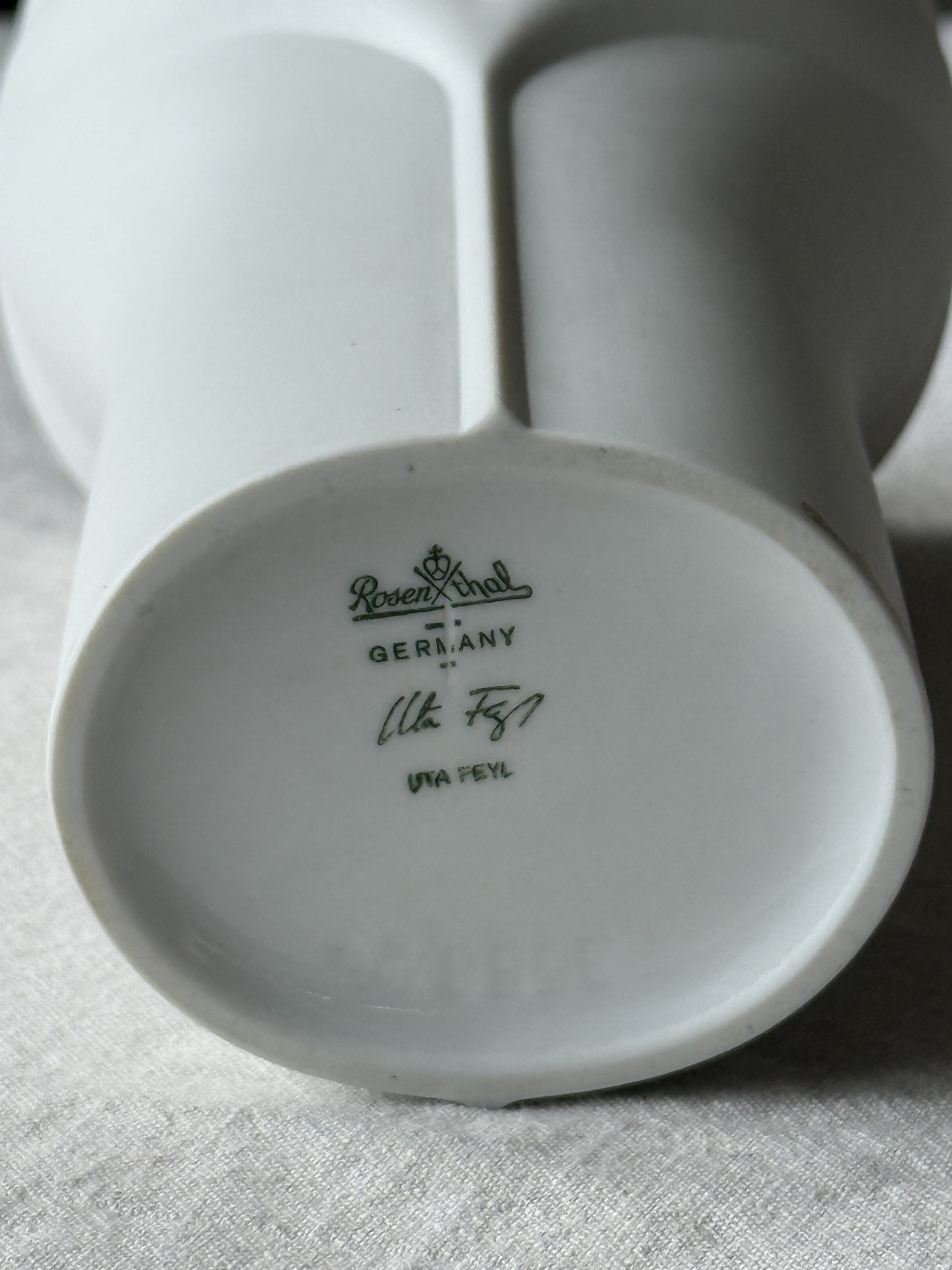 Elegantní designová váza od renomované značky Rosenthal – řada Studio Linie, design Uta Feyl. Vyrobená v Německu na přelomu 70. a 80. let. Minimalistická, moderní forma s jemným podpisem designérky na spodku. Perfektní jako výrazný dekorační prvek v interiéru: samostatně na stolku, komodě nebo ve vitríně. Výborný dárek pro milovníky stylu Mid-Century Modern a kvalitního porcelánu.