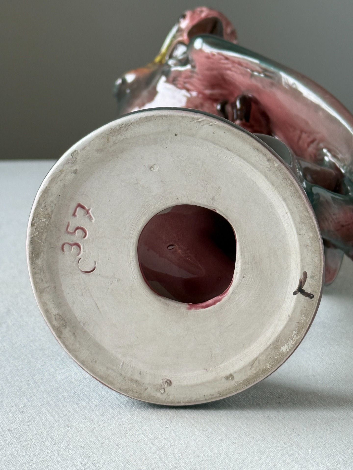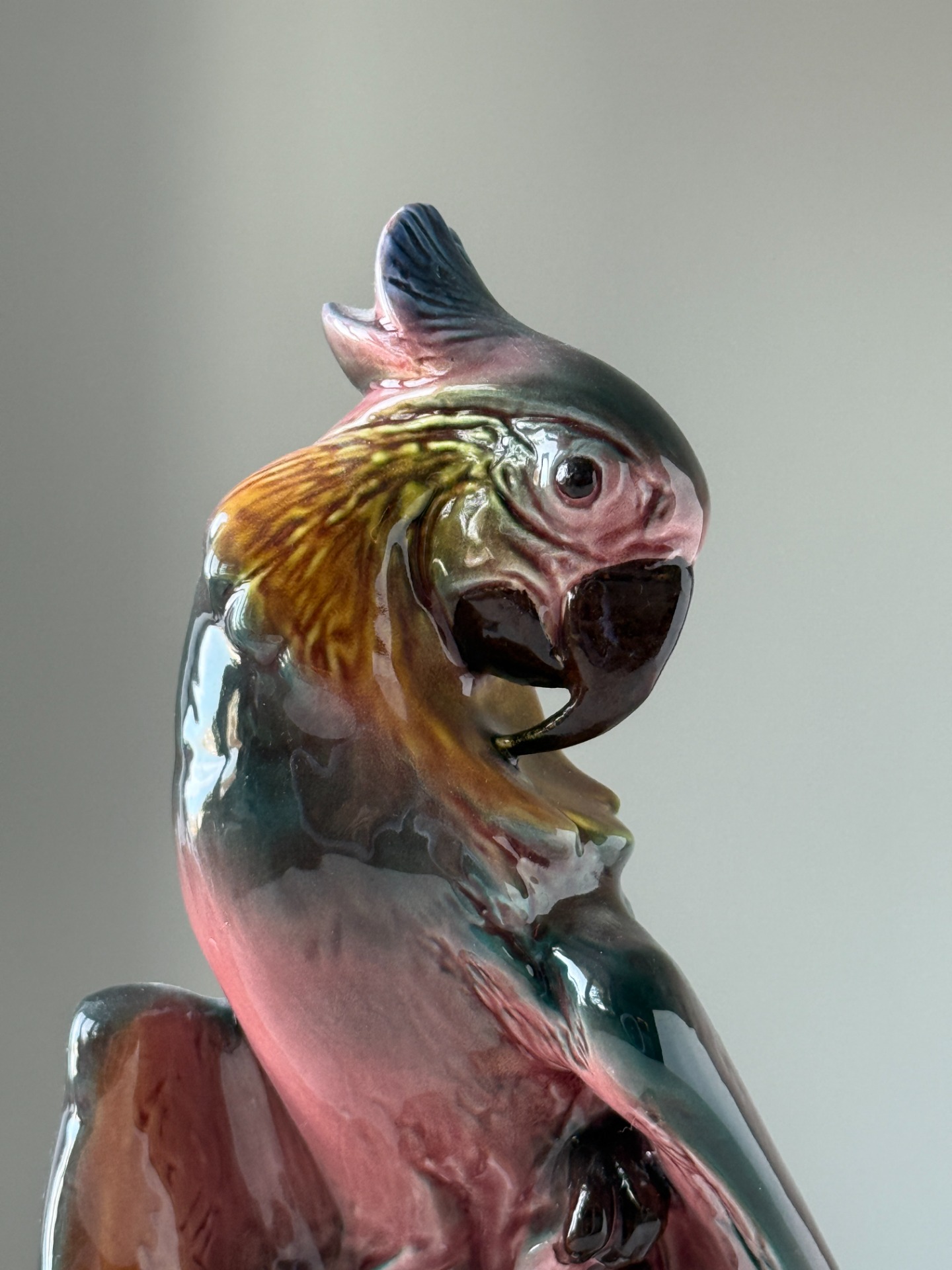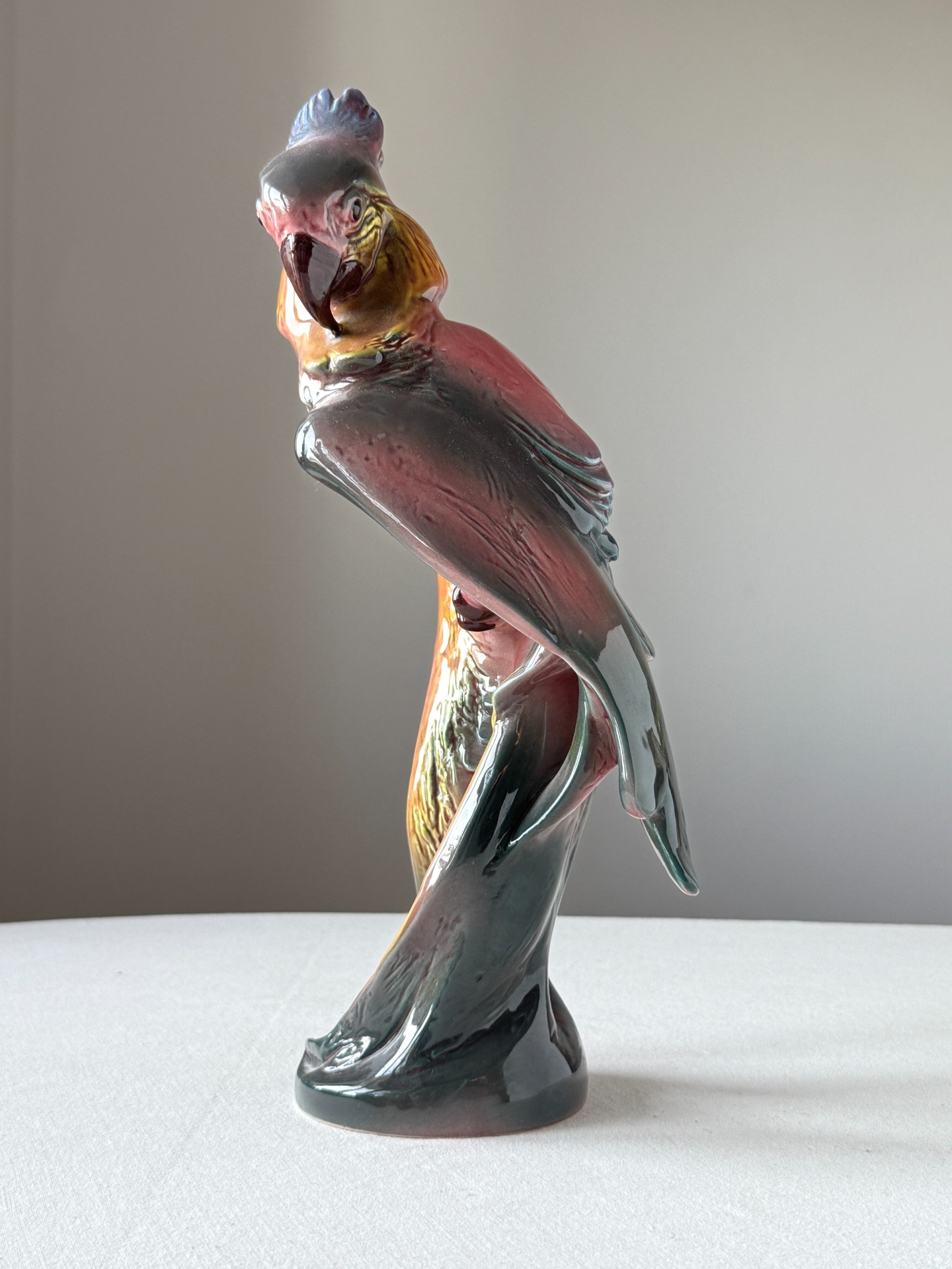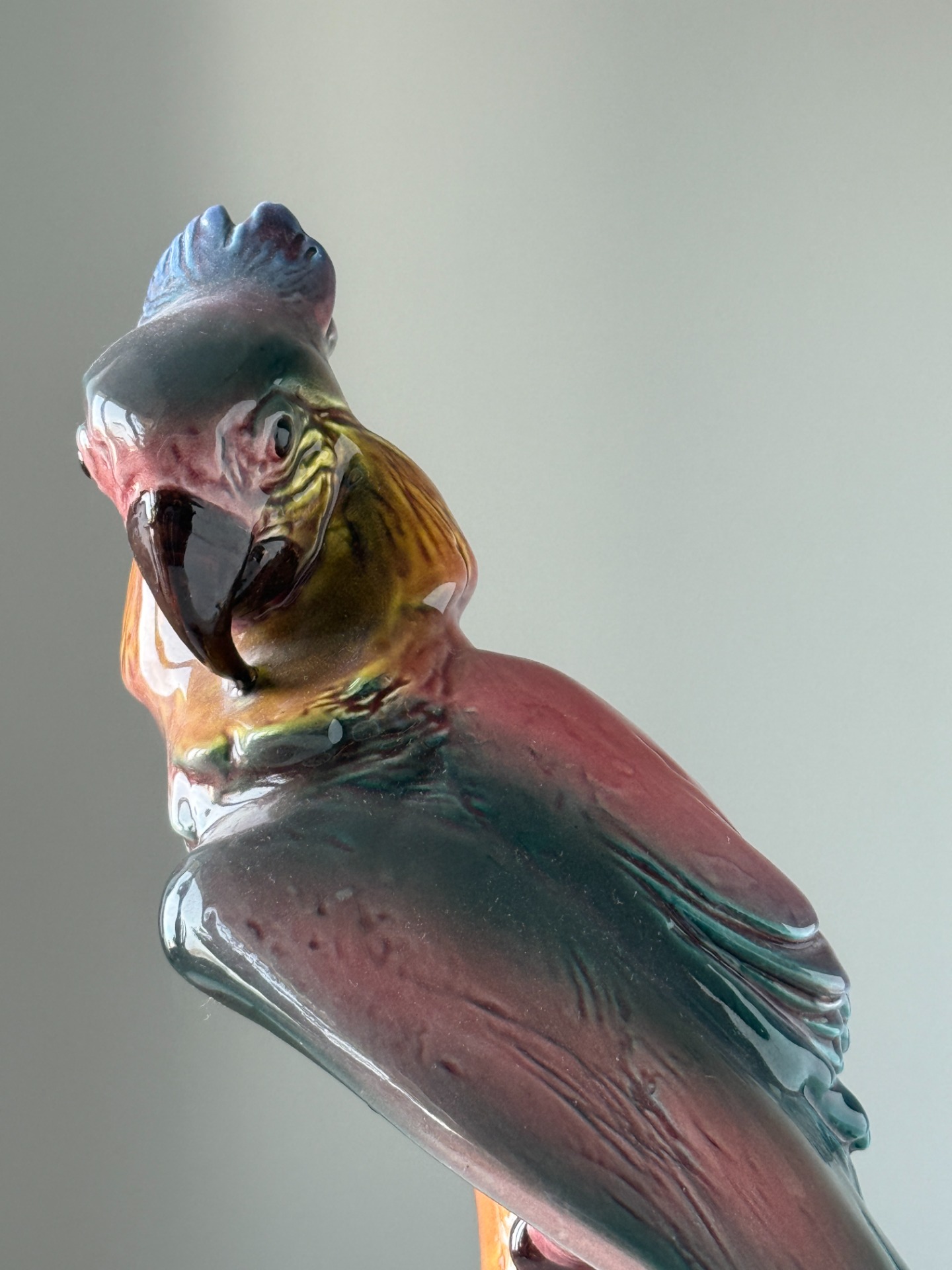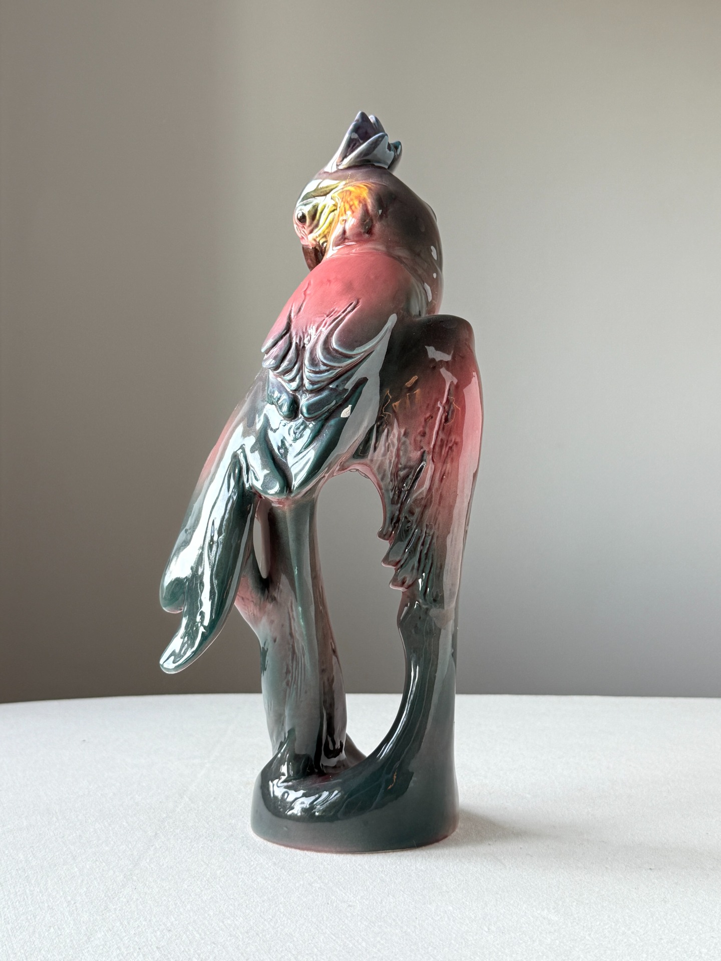 Krásná keramická figurka papouška z dílny Jihokera Bechyně. Papoušek má bohatou vícebarevnou glazuru – od zelených tónů přes růžové až po zlato-hnědé akcenty. Povrch je vysoce lesklý a zvýrazňuje jemné plastické detaily peří a ladně prohnutý tvar těla. Soška je z druhé poloviny 20. století.