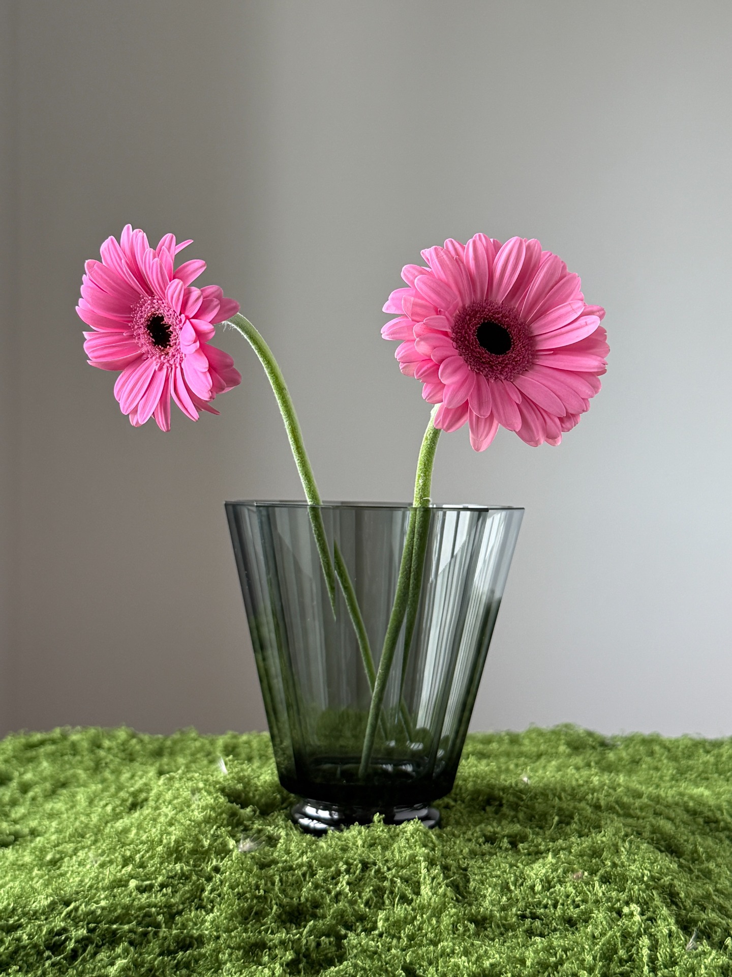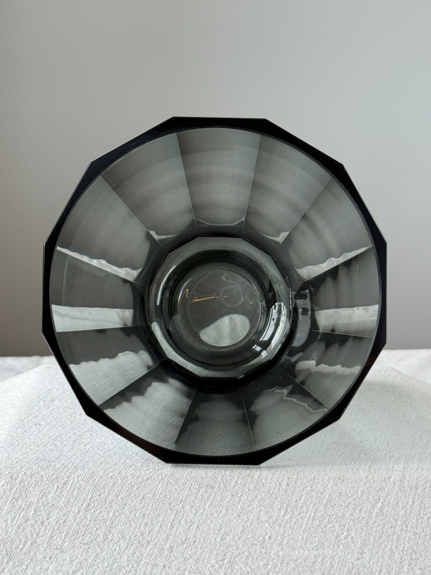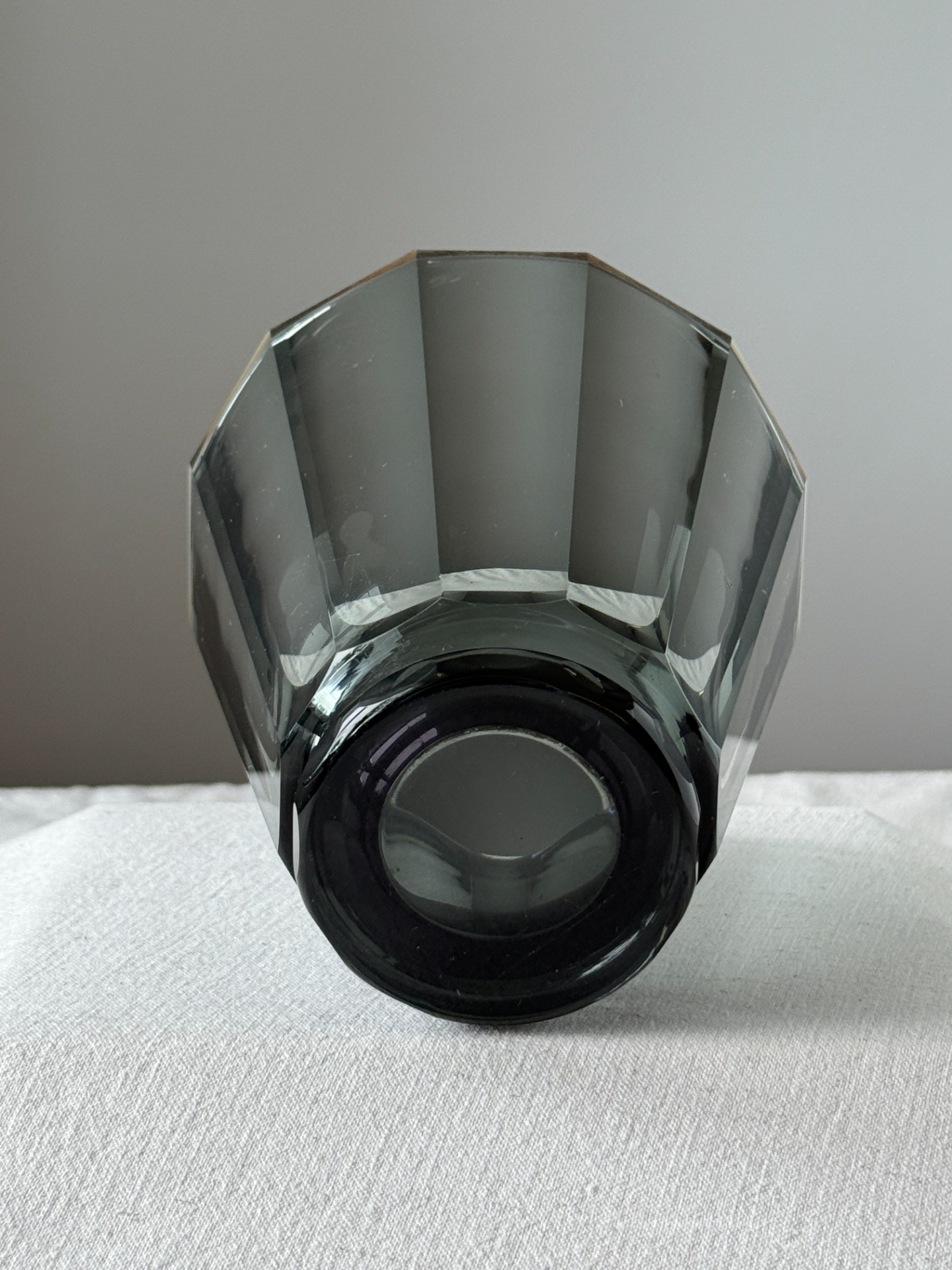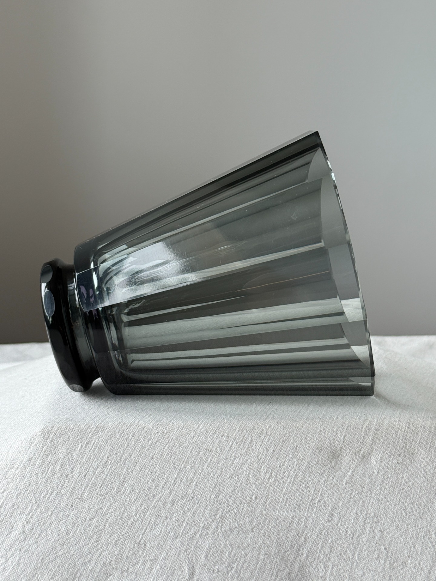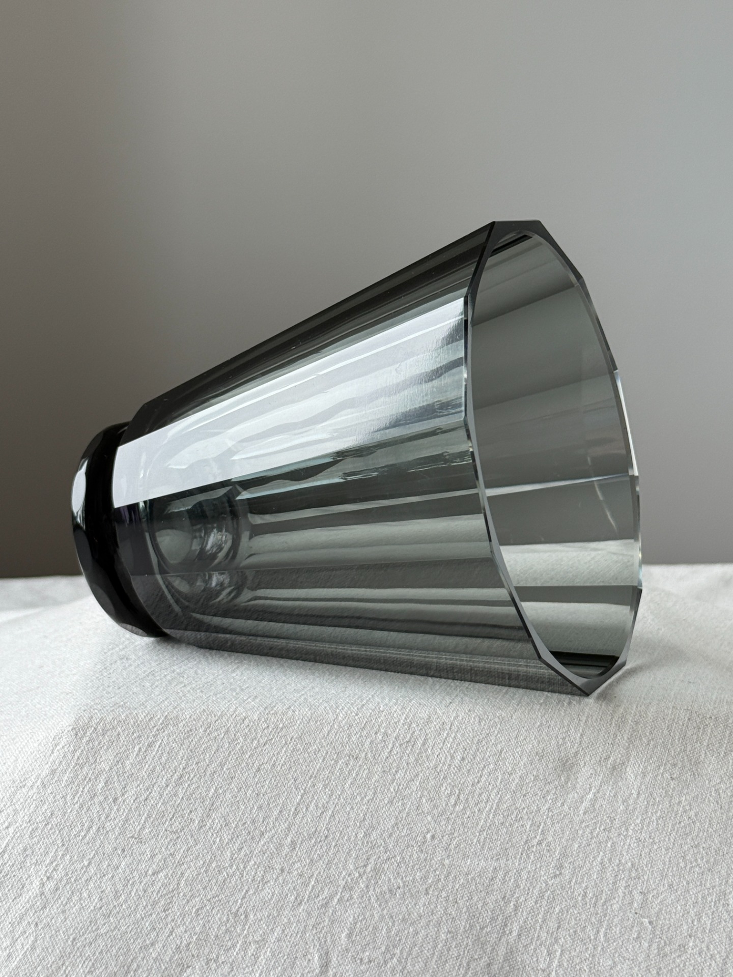 Elegantní váza ve stylu Art Deco z kouřově šedého skla, inspirovaná tvorbou sklárny Moser. Charakteristický je pro ni čistý geometrický tvar s opticky broušeným povrchem a decentní hrou světla na hranách.