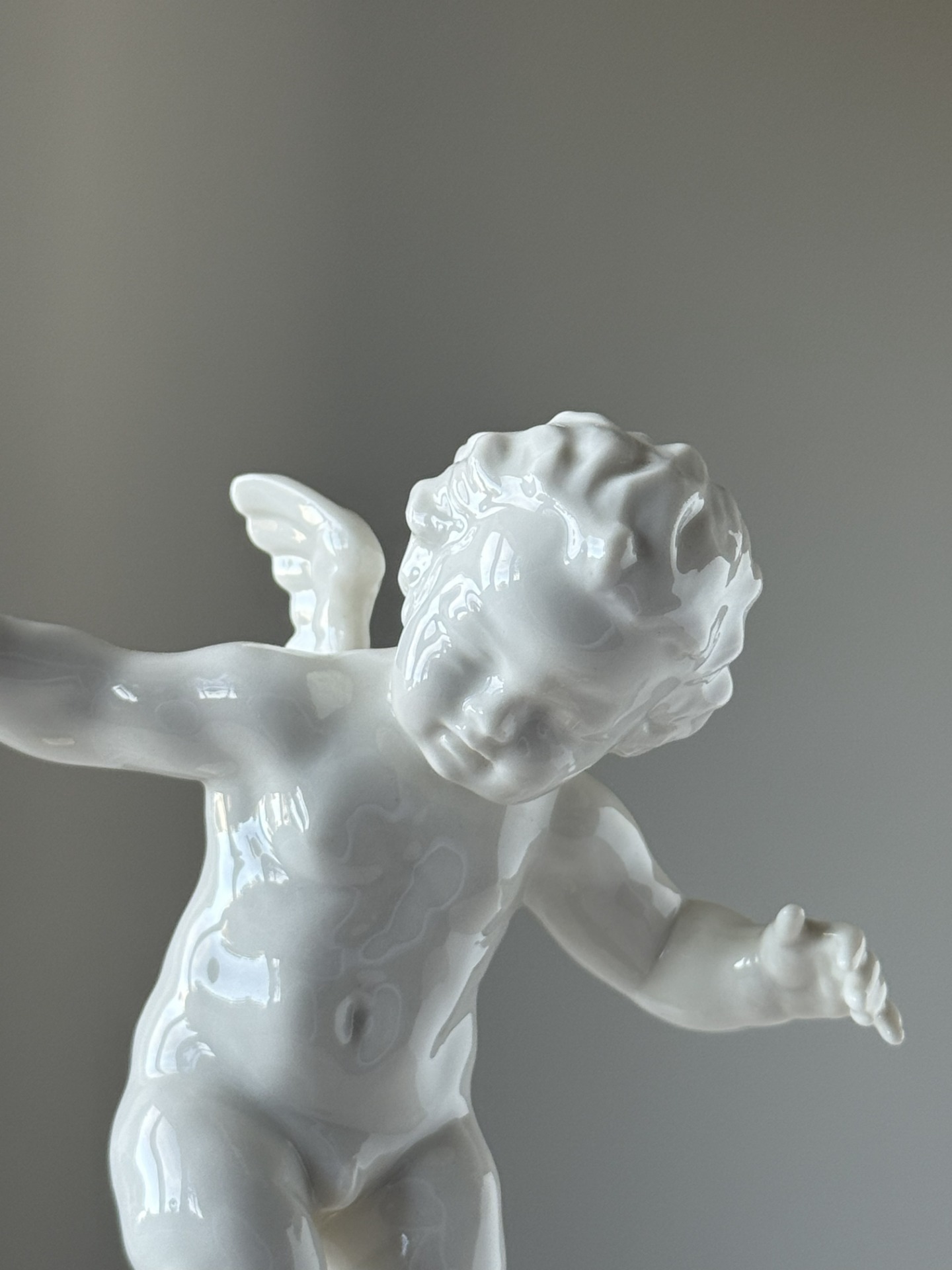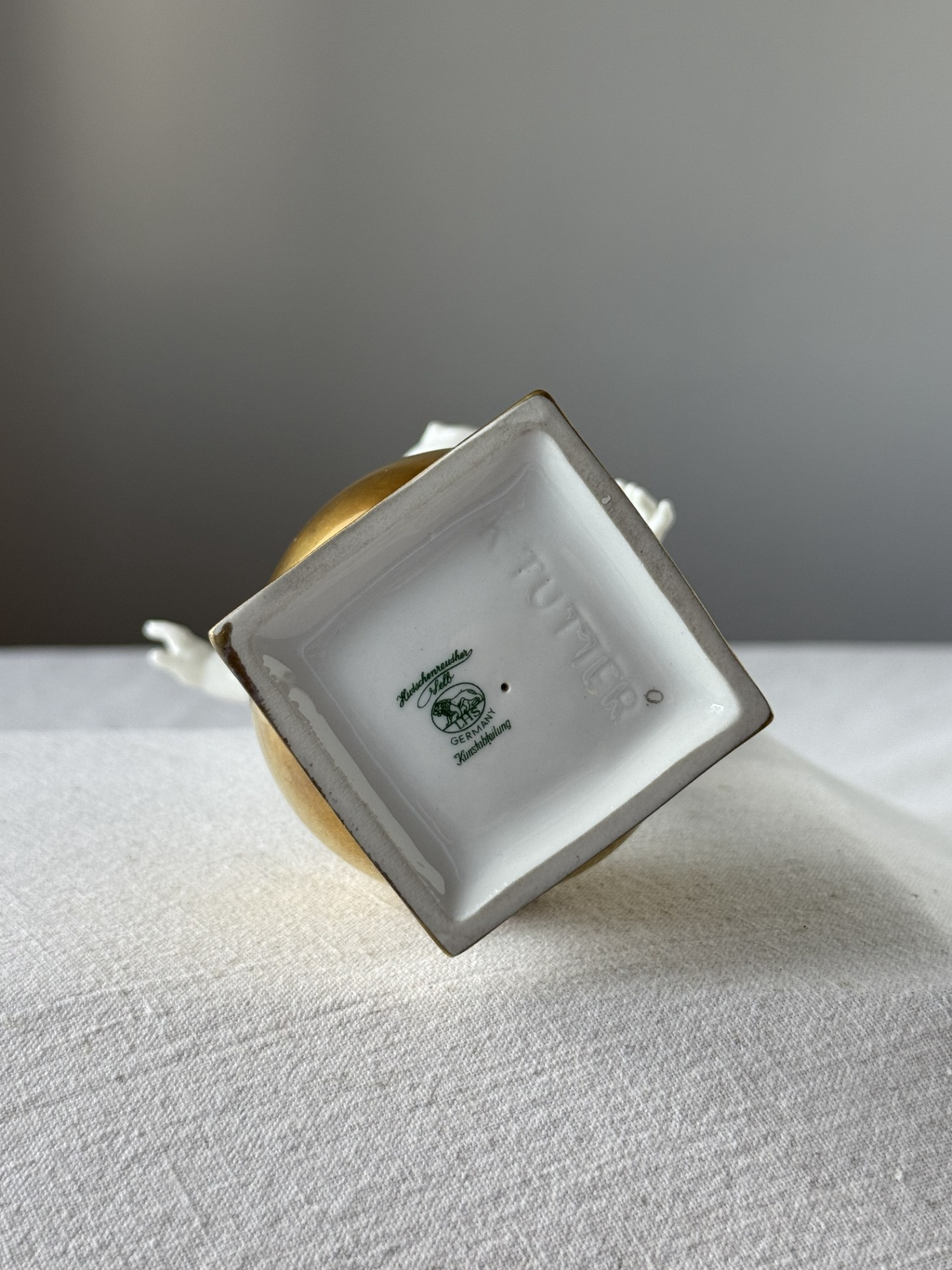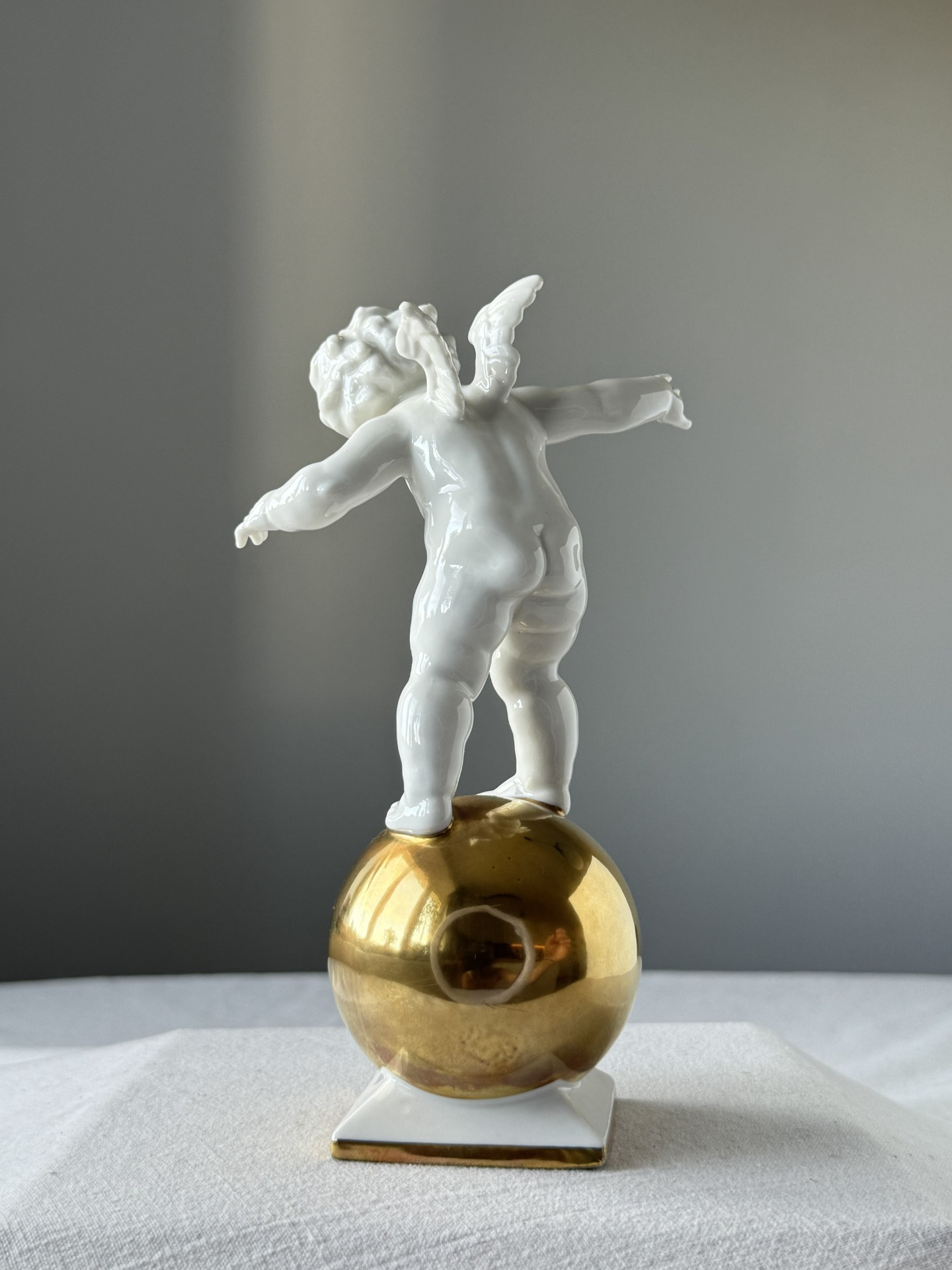 Výjimečná porcelánová figurka z dílny německé porcelánky Hutschenreuther podle návrhu Karla Tuttera - jednoho z neuznávanějších designérů německého porcelánu. Lesklý bílý porcelán se zlatým podstavcem působí velmi elegantně a vynikne jak v klasickém tak v moderním interiéru.