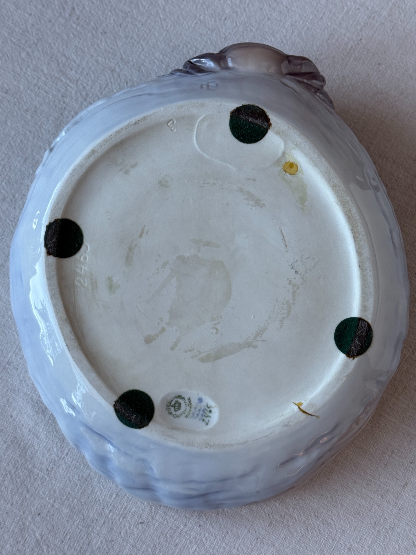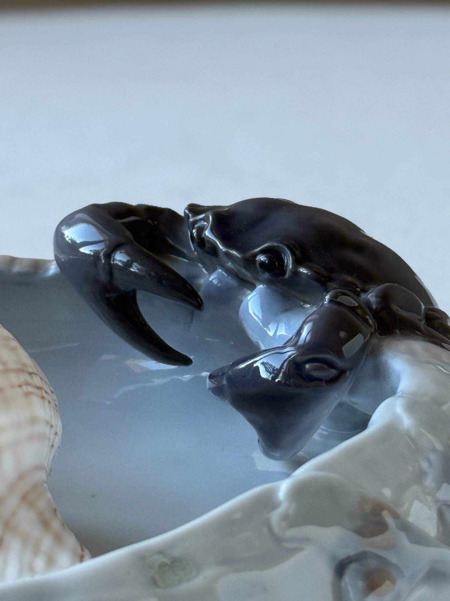 Porcelánová miska Royal Copenhagen (kodaňská porcelánka) z meziválečného období, model 2465. Kousek je dekorovaný výrazným plastickým krabem v temně glazovaném provedení a uvnitř zdoben podglazurní malbou ryby a vodních rostlin v jemných modrošedých tónech. Naturalistická tvorba je typická pro tvorbu Royal Copenhagen v první polovině 20. století a řadí tento kus mezi sběratelsky vyhledávané dekorativní objekty.