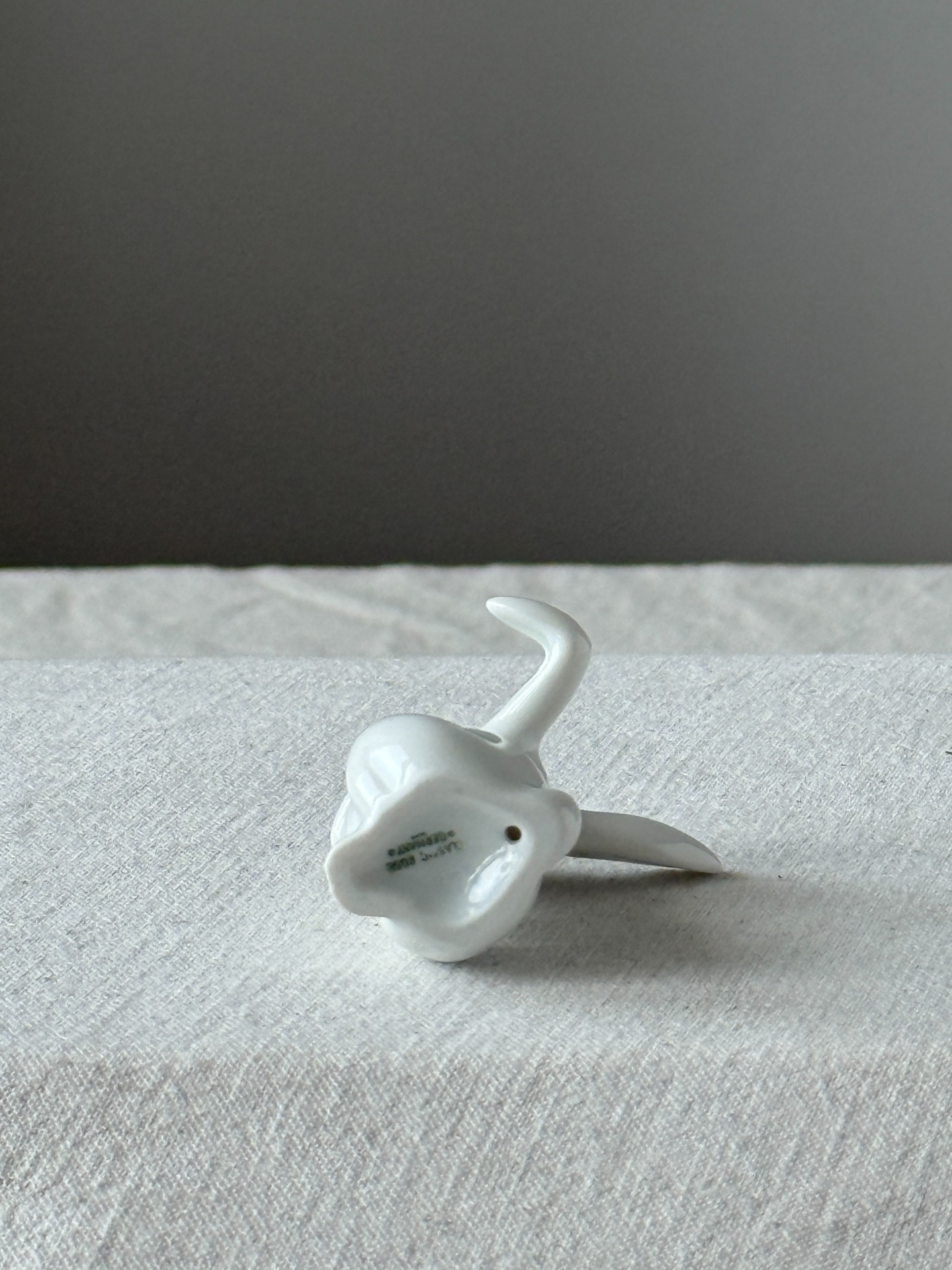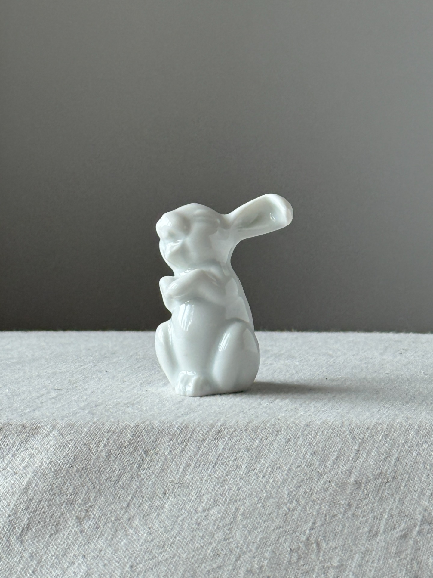 Smějící se zajíček podle ikonického art deco návrhu Maxe Hermanna Fritze pro německou porcelánku Rosenthal. Zajíček je čistě bílý, glazovaný a značený Classic Rose Germany.